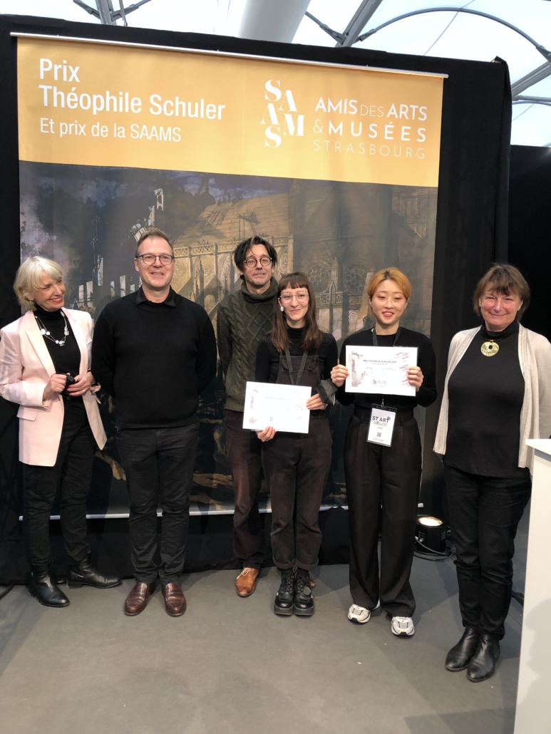 En présence d’Anne Mistler, adjointe à la culture de la Ville de Strasbourg, Bertrand Gillig, Président de la SAAMS et de Geneviève Werlé, Présidente de la Commission du Prix Schuler et des artistes primées. Nahrae Lee, Prix Théophile Schuler 2021 et Anna Guignard, Prix de la SAAMS 2021.