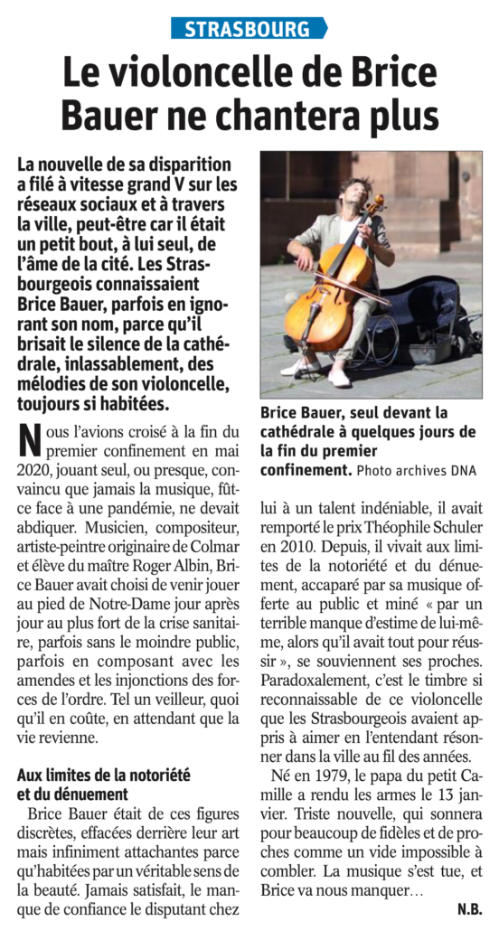 Actualités, Prix Théophile Schuler « Le violoncelle de Brice Bauer ne chantera plus » 16 janvier 2022/par Georgina GAY CHRISTOPHE