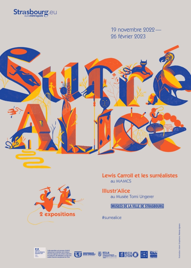 L’exposition aborde la question des changements d’échelle, des liens texte-image, de la notion de passage, de transgression et d’autorité, de la connivence des mondes animal et humain mais aussi du jeu, de cartes ou d’échecs. Enfin, elle interroge les figures d’Alice telle que les artistes femmes ont pu l’appréhender. Leur regard permet d’élargir les points de vue, à la fois sur la figure carrollienne mais également sur les représentations de la femme au sein de l’univers surréaliste. La scénographie originale et surprenante inclut des spécimens du Musée Zoologique de Strasbourg pour incarner le bestiaire de Lewis Carroll et des surréalistes. Le préambule de l’exposition, tout aussi étonnant, a été confié à l’artiste Monster Chetwynd.