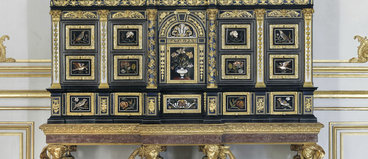 - un Grand Cabinet du XVIIème siècle, en ébène et marqueterie de pietra dura, restauré en 2014,